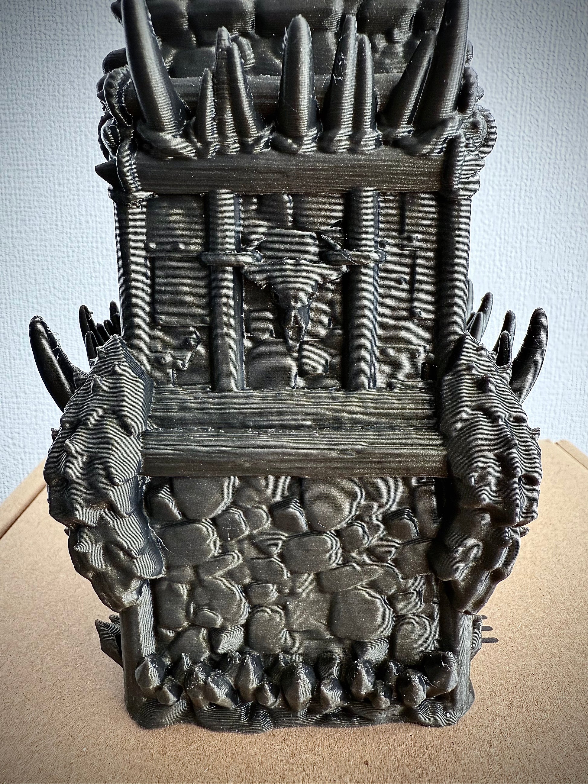 Een orcish dice tower. De details bestaan uit punten, stekels, kettingen, schedels en meer!